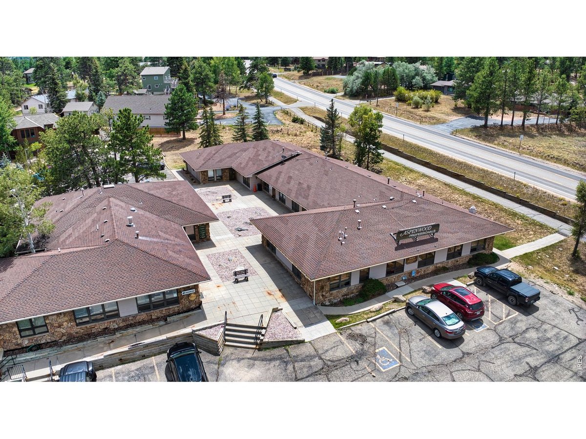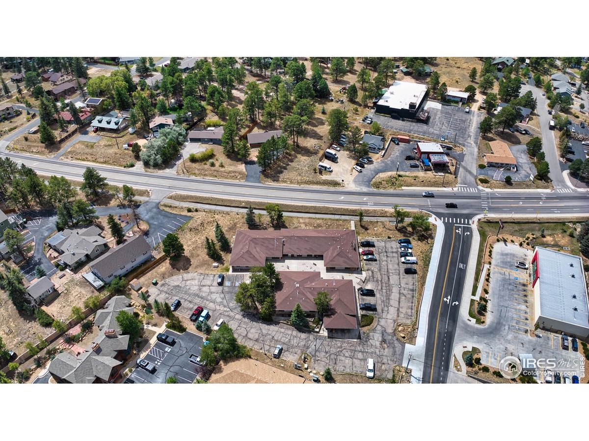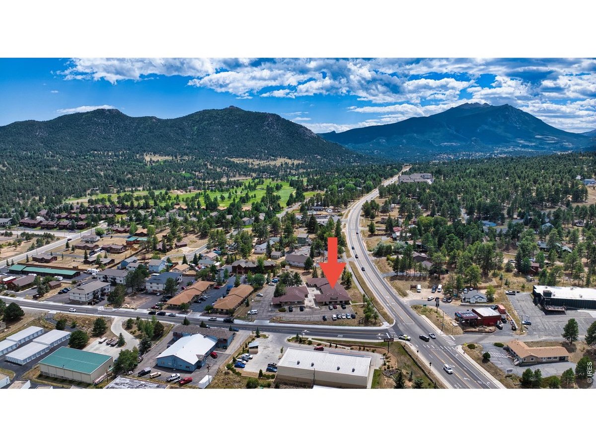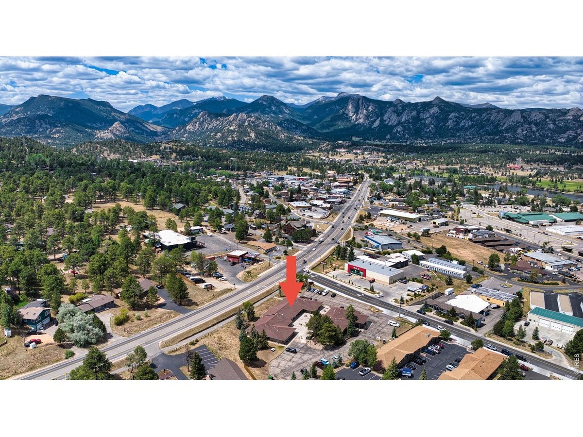 Prime commercial office opportunity in the heart of Estes Park! This property offers unmatched visibility with a strategic corner location and excellent road frontage on a high-traffic corridor. Aerial perspectives highlight the expansive building footprint, generous parking, and multiple convenient access points, making it ideal for businesses seeking strong exposure and accessibility. The courtyard-style layout creates a welcoming entry for clients and employees, while overhead views emphasize the property's efficient design and surrounding open space. Ample parking on both sides of the building ensures convenience, complemented by easy ingress and egress to major roadways. Set within a bustling commercial corridor, this office building is surrounded by established businesses, dining, and retail, further enhancing its value as a central hub for professional use. The panoramic drone imagery showcases not only the property itself, but also its incredible setting within Estes Park-nestled against a backdrop of the Rocky Mountains and steps from thriving commercial activity. Whether for medical, professional, or mixed-use office space, this property presents a rare chance to establish or expand your business in a highly visible, well-situated location.